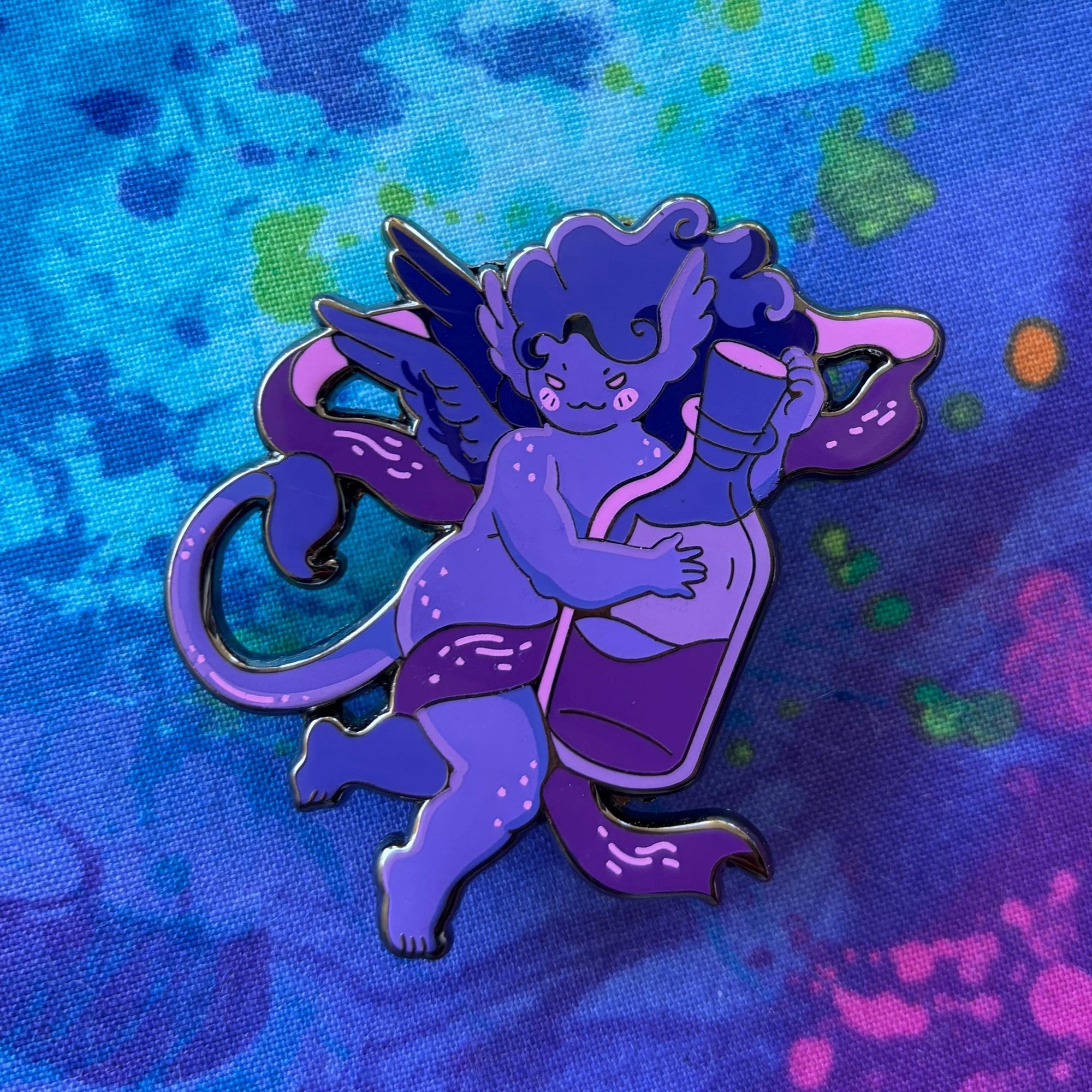 | A little putto (cherub) for the constellation Scorpio. Each pin is about 2.1 inches wide with hard enamel, black nickel plating, and screenprint. They have two pin posts and rubber backings. |