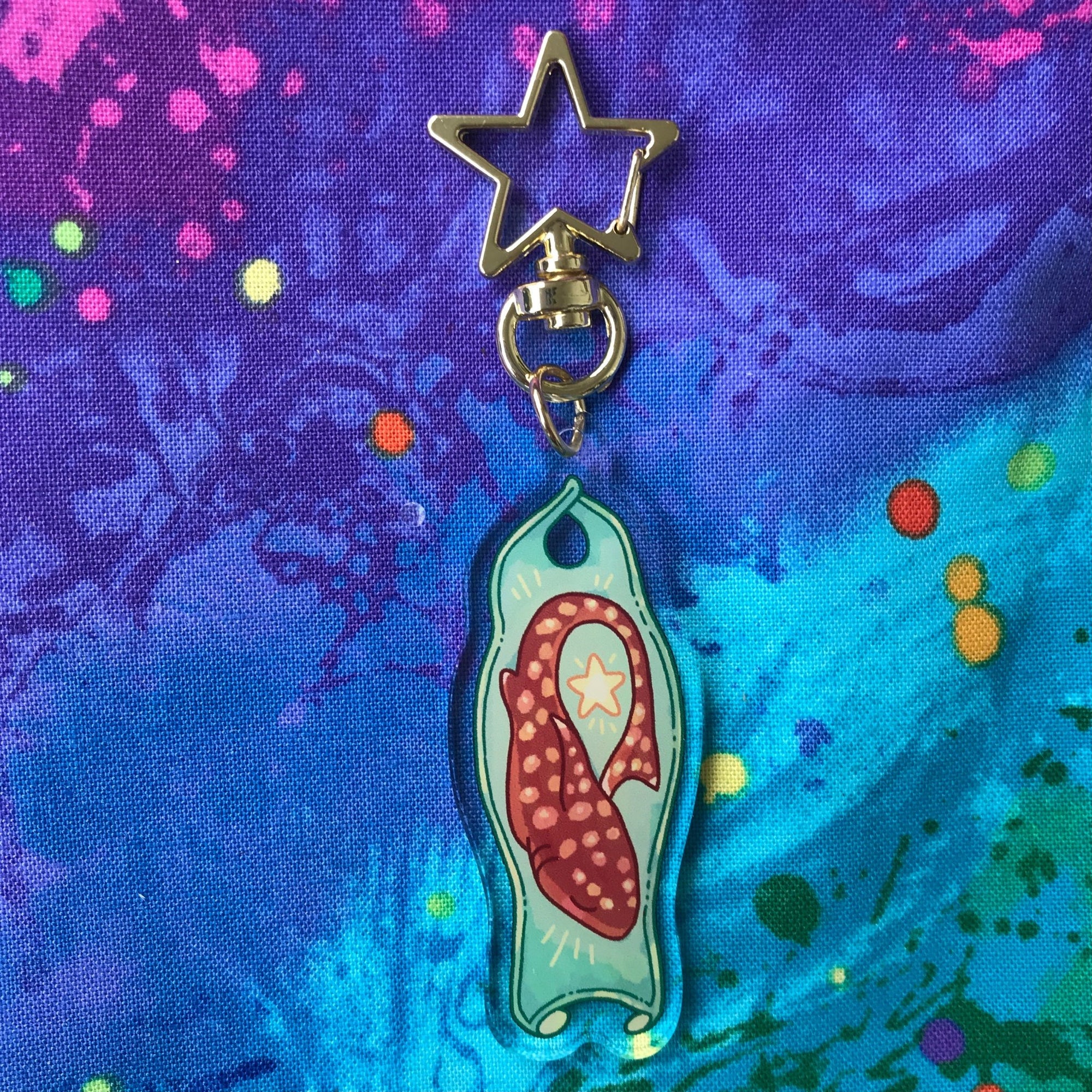 | A celestial shark egg. This acrylic keychain is 2.5 inches (6.3 cm) long, double-sided with the same print on both sides. The keychain has a gold star clasp. |