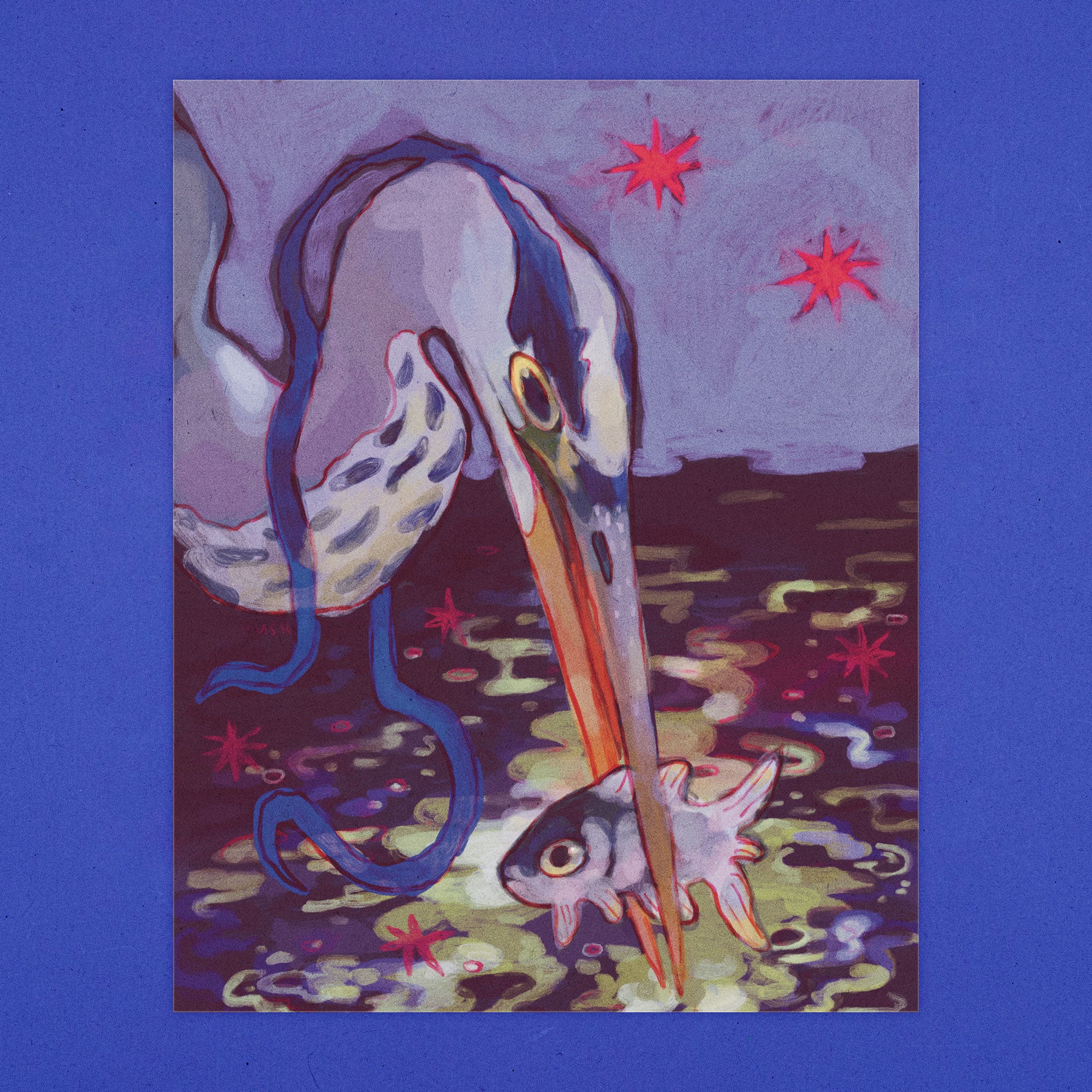A great blue heron among a sparkling stream, searching for that perfect snack. 8 x 10" print on 300gsm paper.