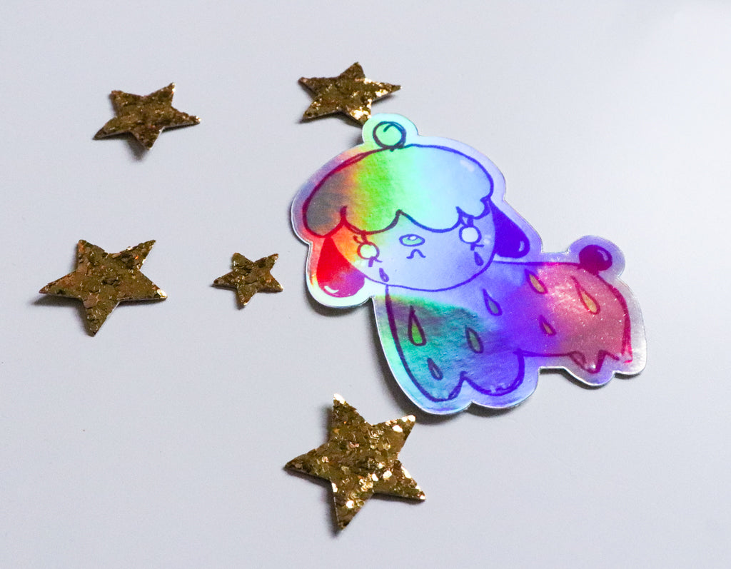What a sweet, succulent strawbaby dog. Holographic vinyl sticker printed by Stickermule.