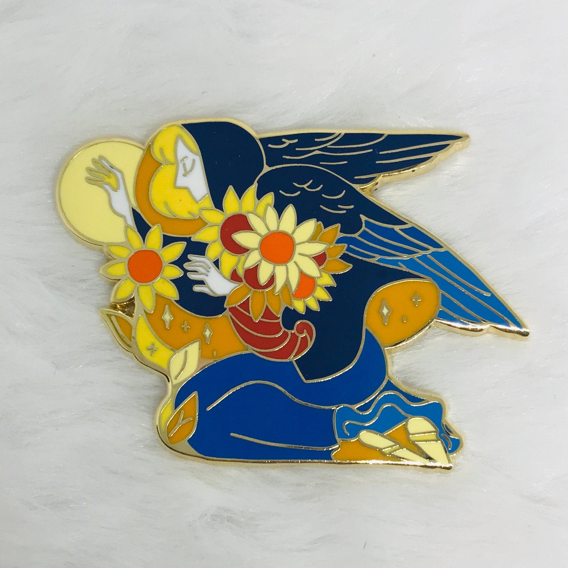 An angel of sunflowers. This design is inspired by a 2008 Ukrainian angel stamp. This pin is approximately 2 in (5 cm) wide. The pin has hard enamel, gold plating, and two pin posts with rubber clutches.This listing is for mixed grade pins. You may receive a standard grade pin, which has minimal or no flaws; or a seconds grade pin, which may have more notable flaws. For my complete pin grading policy, please see my About & FAQ: linktr.ee/ultra.infinite