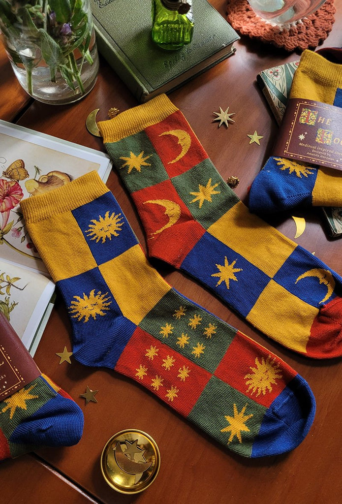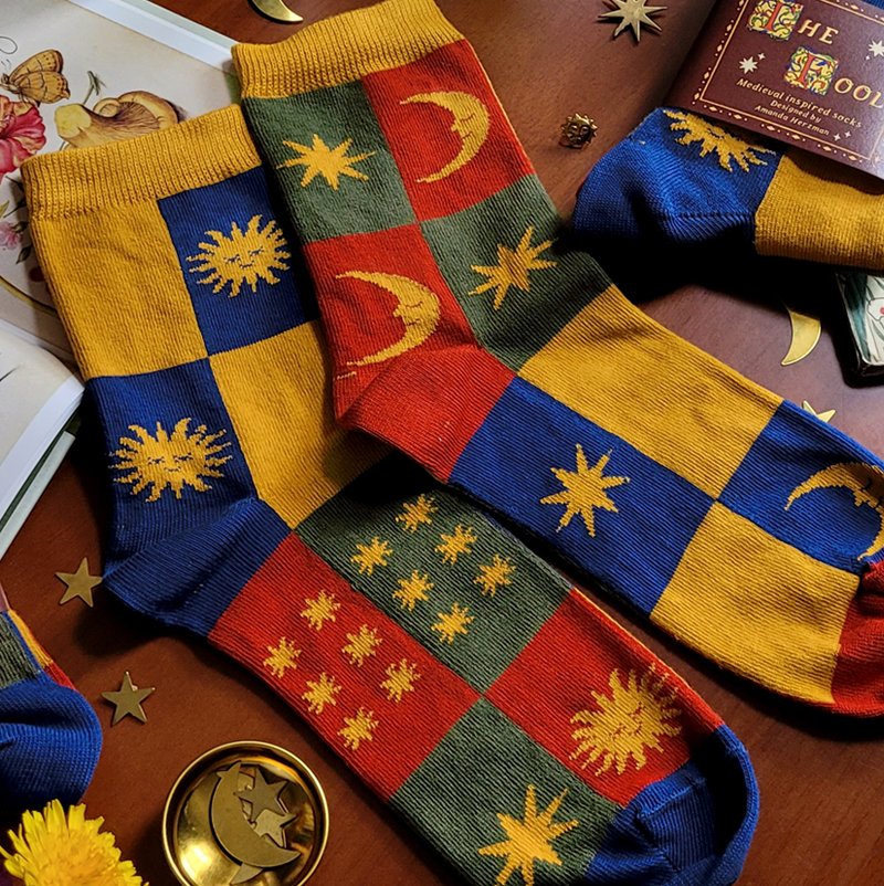 The fool socks are fancy jester-inspired socks to prance in. With deep jewel tones and celestial motifs, these socks are made for revelry and merry making. Wear them on your next adventure!