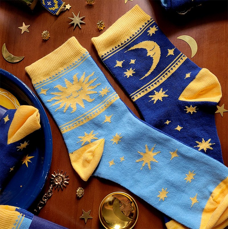 Wear the day and night on your feet! These are split side socks, so when worn one side will show the sun, and the other side will show the moon. Inspired by my own nostalgia of 90s celestial, these socks capture the moon and sun at your feet.