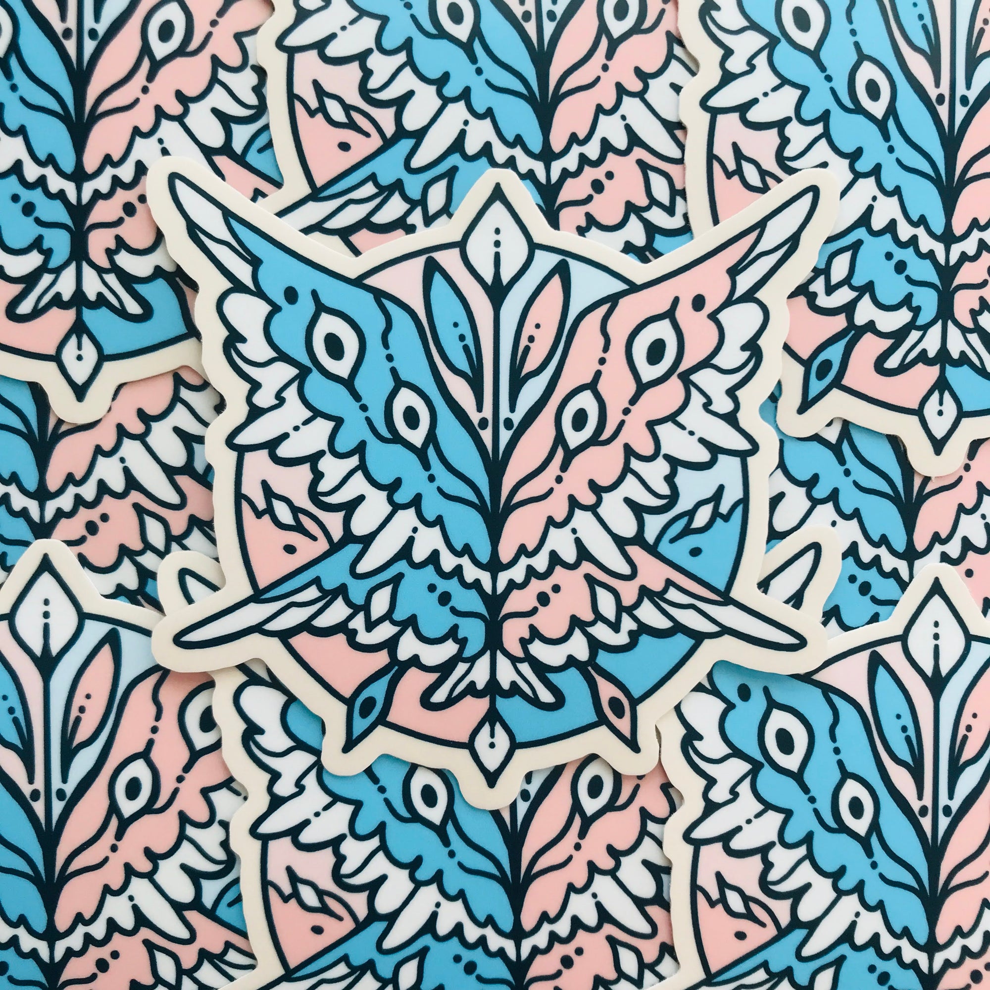 A moth-like seraph with pink and blue wings, for Transgender pride. This sticker is approximately 3 inches (7.6 cm) on the longest side, and printed on matte vinyl.