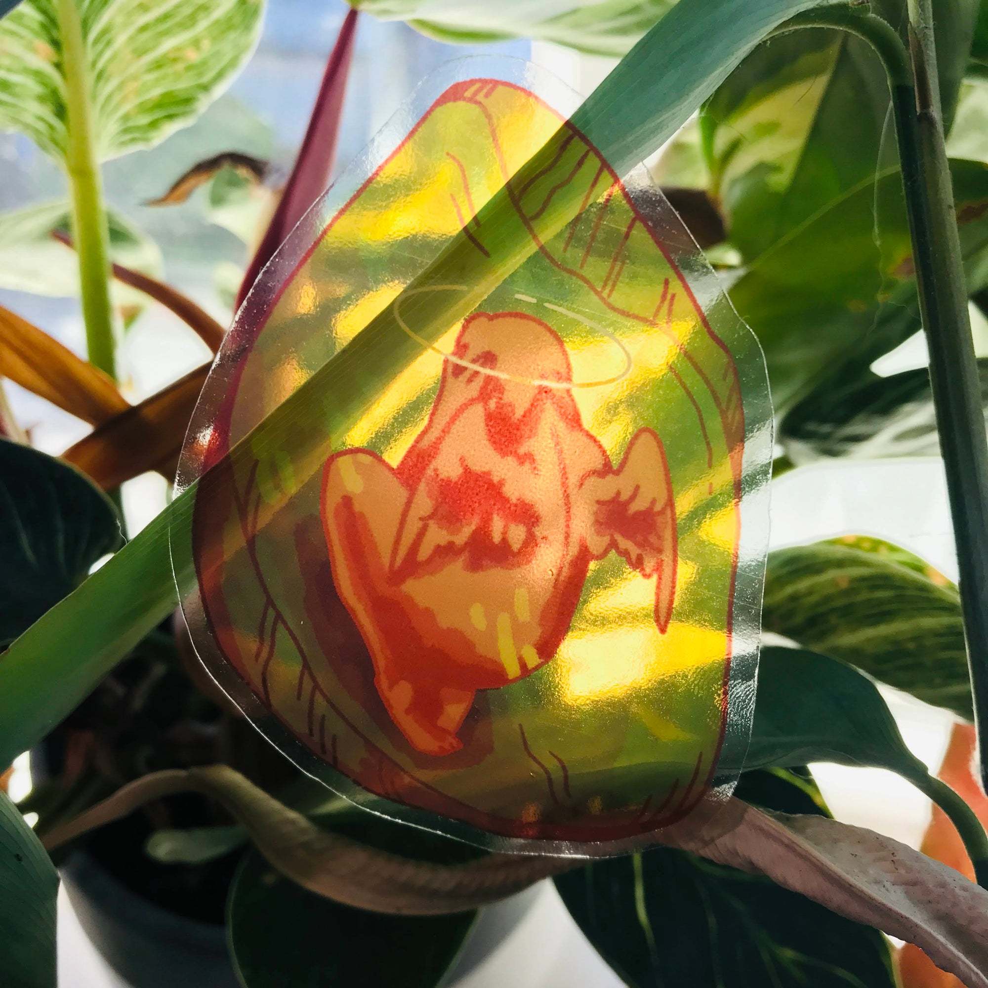 An angel trapped in amber. This sticker is approximately 3 inches (7.6 cm) on the longest side. It is printed on clear glossy vinyl.