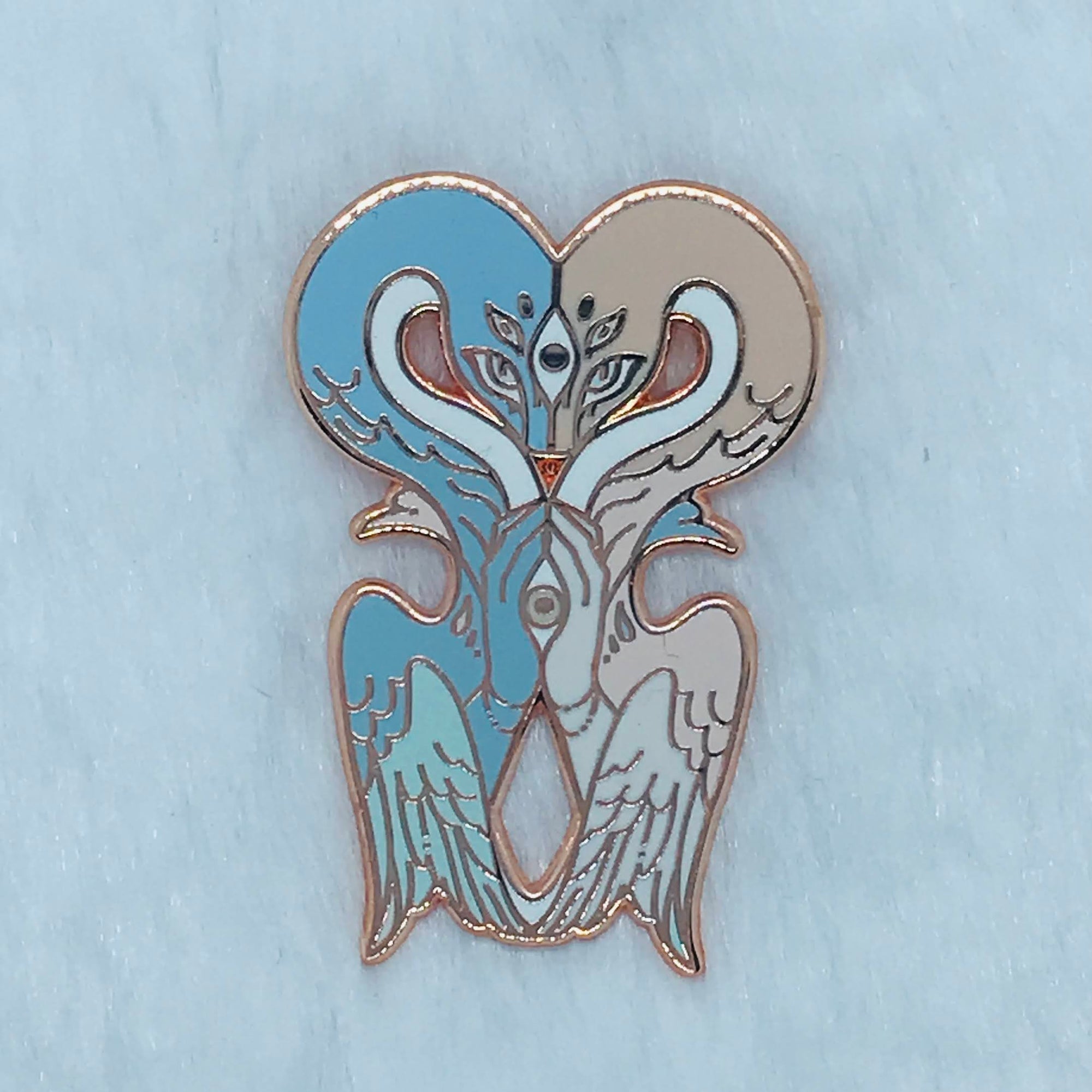 Twin angelic serpents with an all-seeing gaze. This pin is approximately 1.2 in (3 cm) wide. The pin has hard enamel, and two pin posts with rubber clutches. It is available in pastel with rose gold plating.