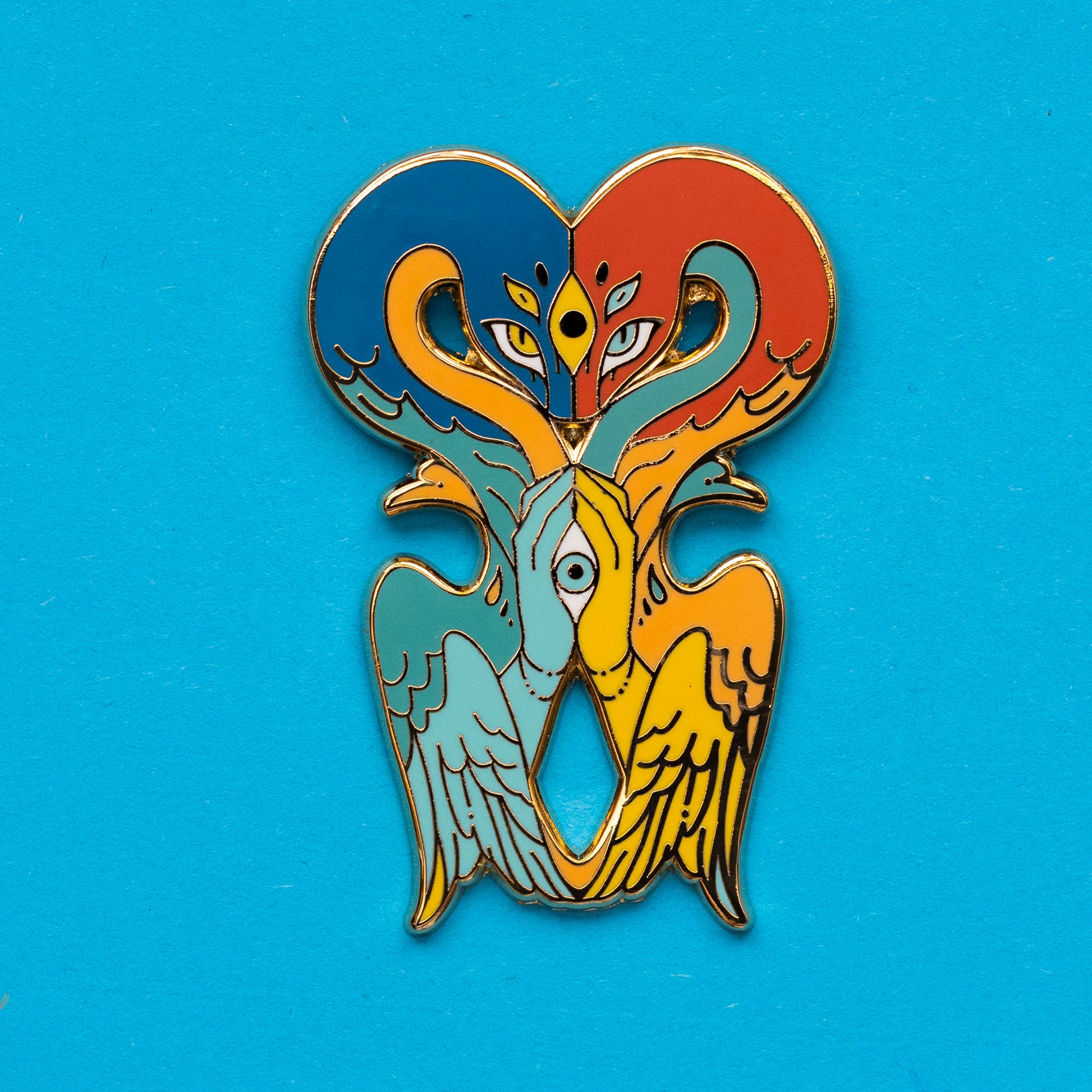 This pin is approximately 1.2 in (3 cm) wide. The pin has hard enamel, and two pin posts with rubber clutches.