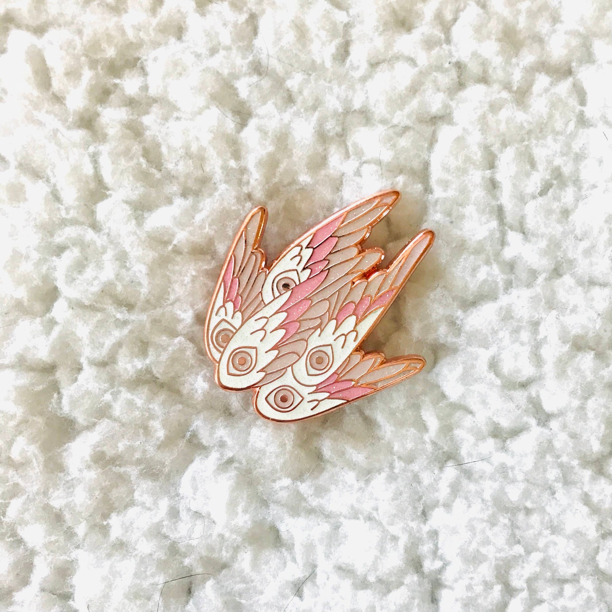 Each pin features pink glitter hard enamel, rose gold plating, and two pin posts with heart-shaped rubber clutches. It is 1.3 inches (3.5 cm) long.