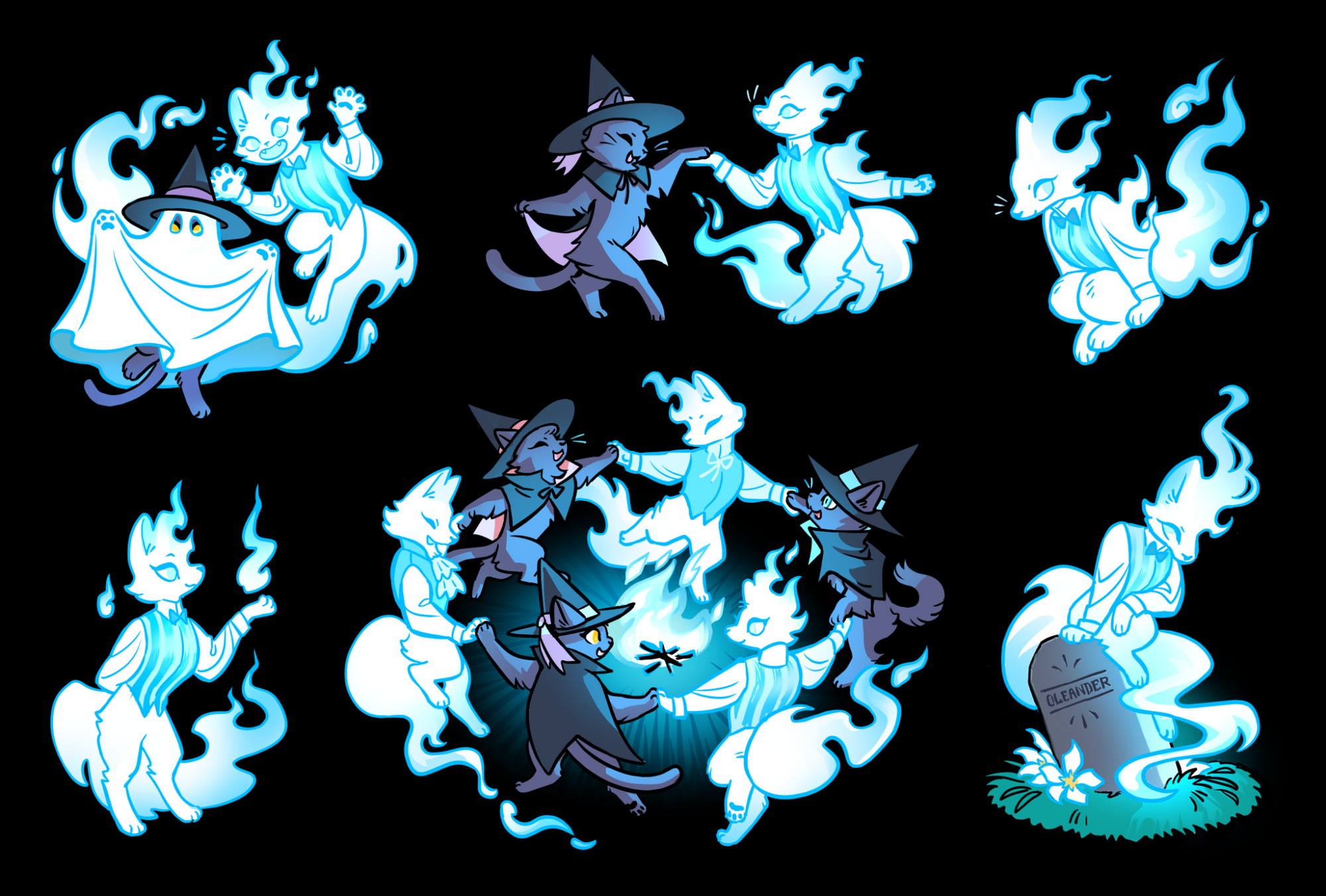 An extra witch kitty and pals sticker set for 2024! The kitties and their foxy phantom friends get together on All Saints night to dance the night away.