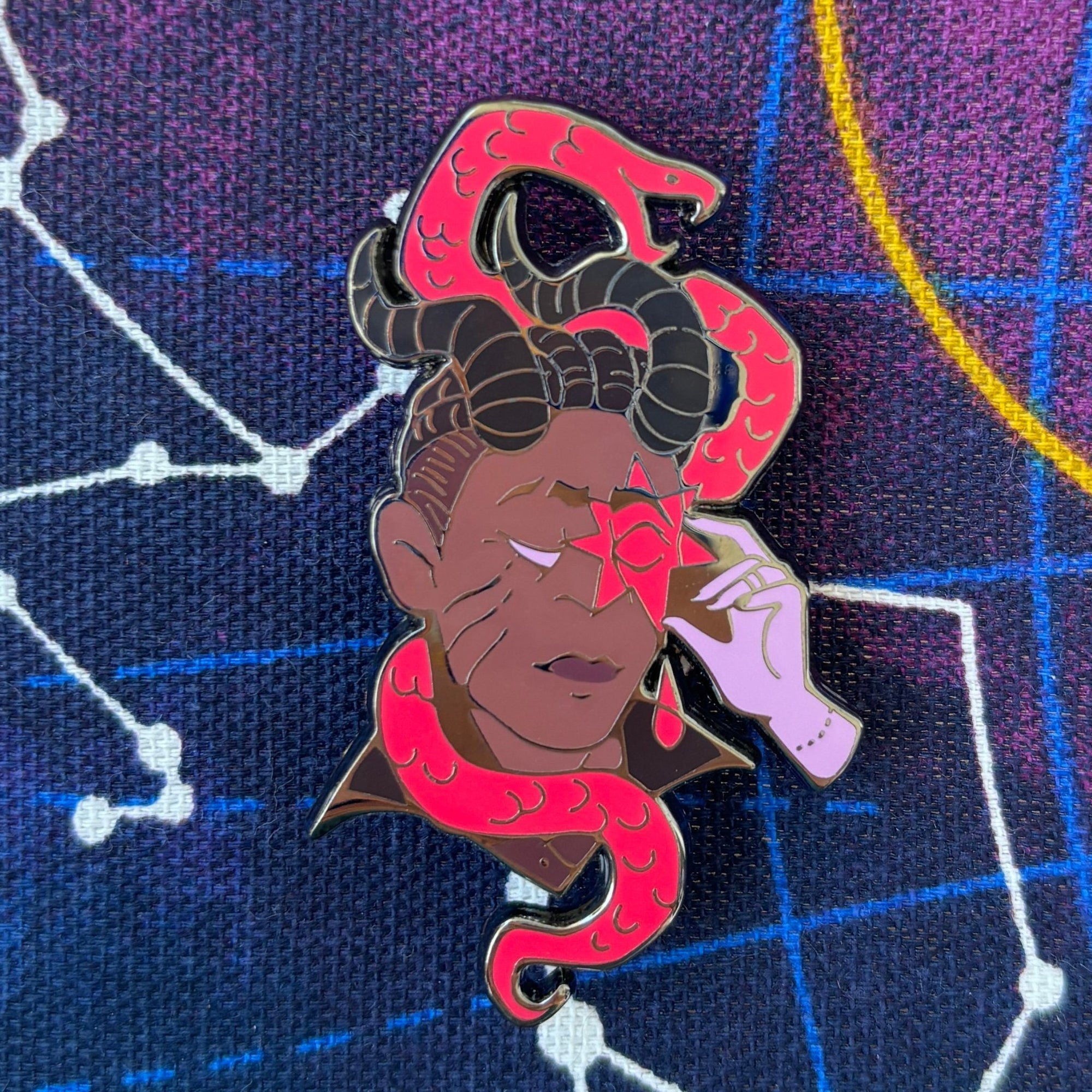 | Wyll is 2.3 inches long with hard enamel, black nickel plating, and screenprint. He has two pin posts with rubber backings. This listing is for seconds grade pins. |